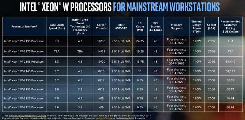 Los nuevos procesadores de Intel están un paso adelante de la actual multitud de procesadores Xeon, utilizando el socket LGA 2066 y balanceando la arquitectura Skylake-SP. estos nuevos procesadores vienen en variantes de 8/10/18 núcleos, con la tecnologÃa Turbo Boost que impulsa las velocidades del reloj de la CPU hasta los 4.5GHz.