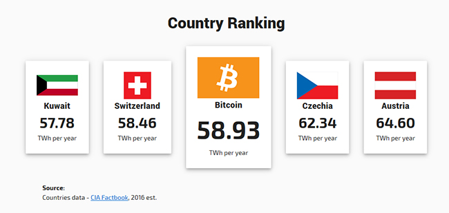 El Bitcoin, según los cálculos realizadas por el grupo de investigadores, consume más electricidad por hora (58,93TWh) que Suiza (58,46 TWh) y Kuwait (57,78 KWh), y es superada ligeramente por la República Checa (62,34 TWh) y Austria (64,60 TWh). En América Latina Argentina consume unos 121 TWh, México unos 258 TWh y Colombia unos 68,25 TWh. Todas las estimaciones de los países son datos de la CIA.