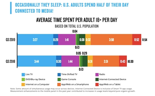Según un reciente reporte de la consultora Nielsen en Diciembre de 2019 los consumidores de los Estados Unidos tuvieron unos 646.152 programas disponibles para elegir, considerando televisión linear tradicional y servicios de streaming. Esto supuso un incremento de la oferta del 10% en relación a igual periodo en 2018.